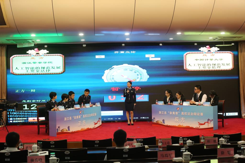启动仪式后,进入了紧张的“亲青帮”高校法治辩论赛总决赛环节。面对“人工智能的规范发展主要靠法律还是伦理?”这一辩题,正方浙江警察学院和反方中国计量大学展开激烈辩论。