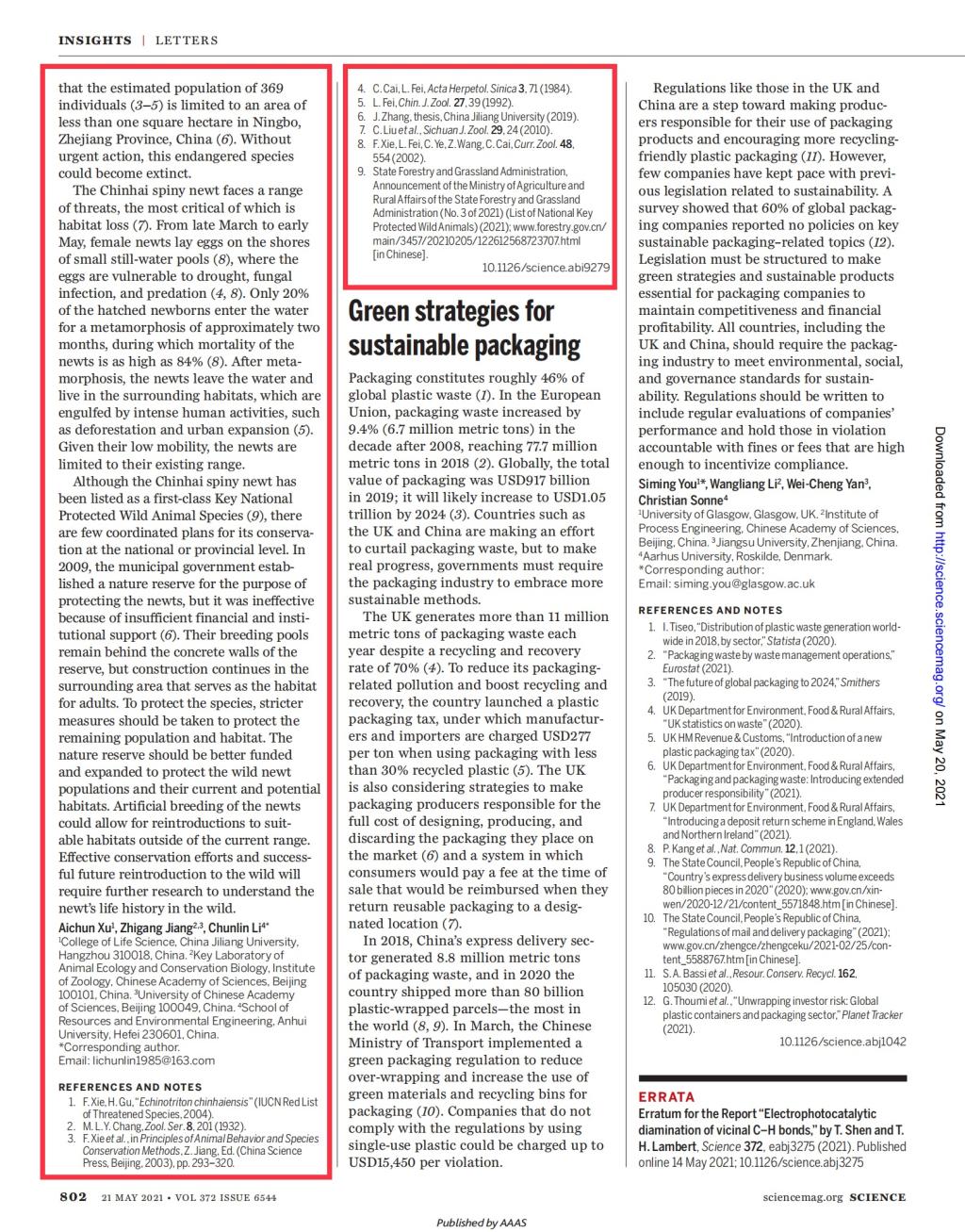 2021年5月21日,我校生命科学学院教师徐爱春博士(第一作者及第一作者单位)、安徽大学和中国科学院动物研究所在《Science》上联合发文(Letter),为极度濒危物种镇海棘螈(Echinotriton chinhaiensis)的保护献计献策。