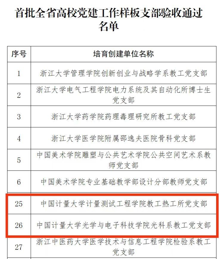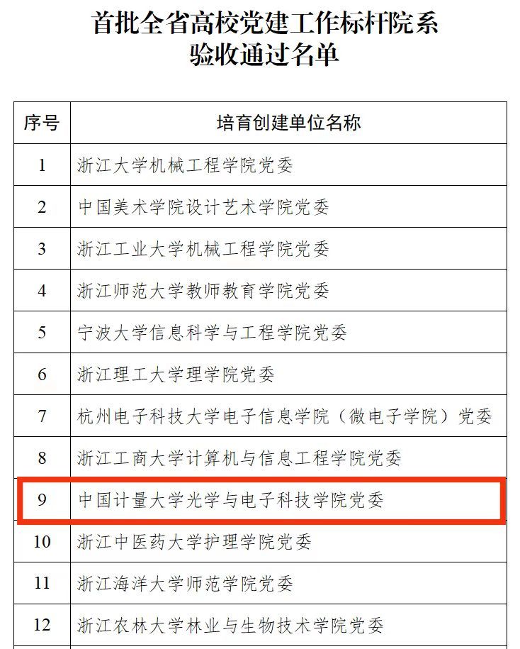 10月17日,中共浙江省委教育工作委员会办公室印发《关于公布首批全省高校党建工作示范高校、标杆院系、样板支部培育创建单位验收通过名单的通知》,我校省党建工作标杆院系光学与电子科技学院党委、样板支部计量测试工程学院教工热工所党支部和光学与电子科技学院光科系教工党支部,经对标自查总结、专家审查复核和公示,由浙江省委教育工委认定通过验收。