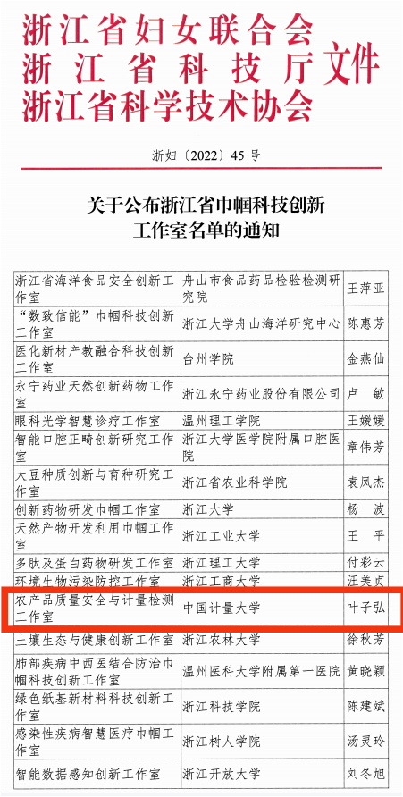 近日,省妇联、省科技厅、省科协联合发文公布了浙江省巾帼科技创新工作室名单,我校叶子弘教授领衔的“农产品质量安全与计量检测工作室”成功入选。