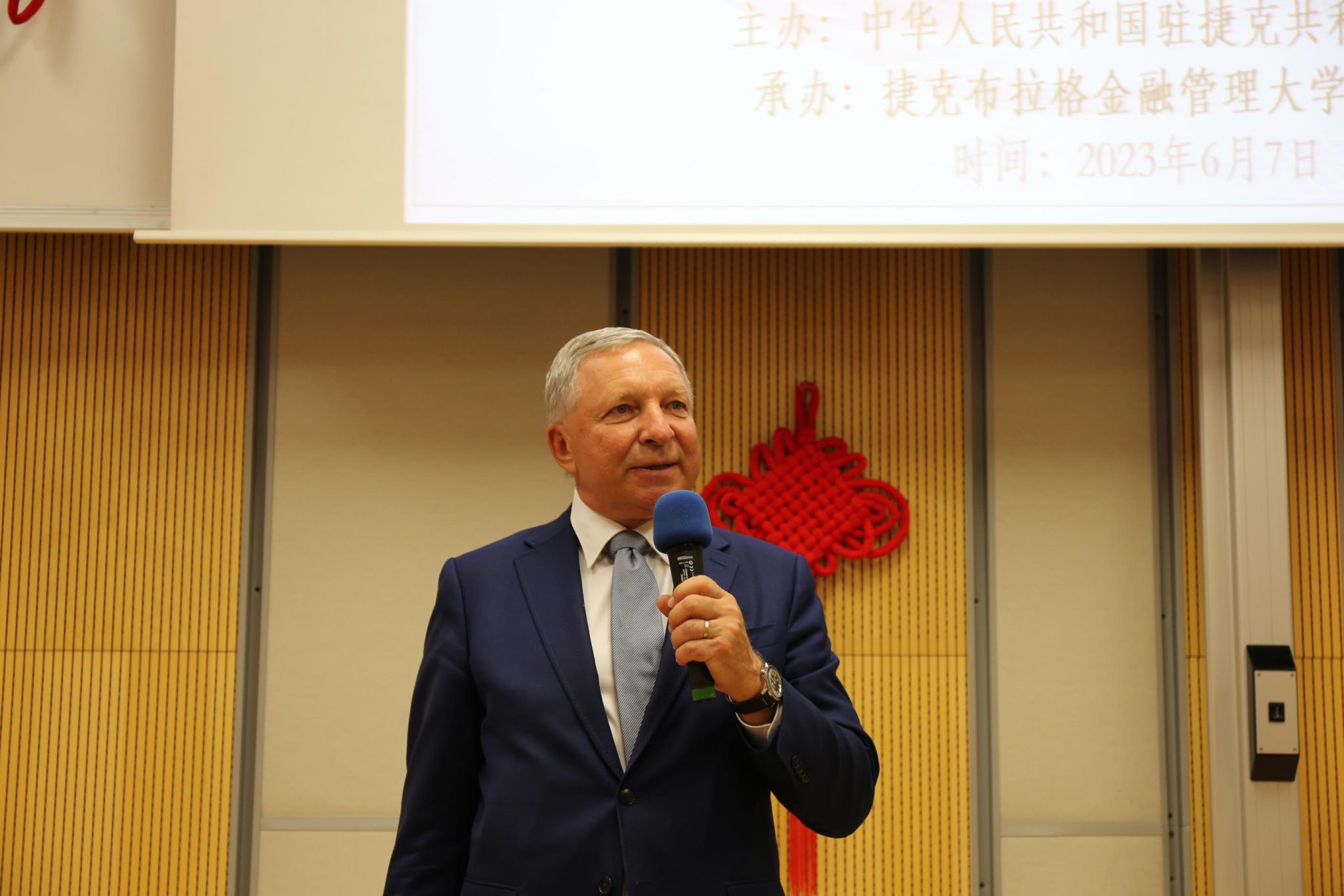 布拉格金融管理大学副校长Petr Budinský在致辞中首先感谢大使馆将汉语桥比赛委托孔子学院承办,他表示自2018年以来,孔子学院就成为布拉格金融管理大学不可或缺的一部分,在布拉格金融管理大学和中国计量大学的共同努力下,孔子学院已经顺利运行近五年,未来还将继续深化合作。他介绍说,孔子学院的活动主要集中在三个方面:一是组织汉语教学以及汉语水平考试,二是开展系列中国文化活动,三是组织中文教学及翻译、汉学相关主题的研讨会。此外,孔子学院还结合所在大学的经济和商业智库定期发行院刊。