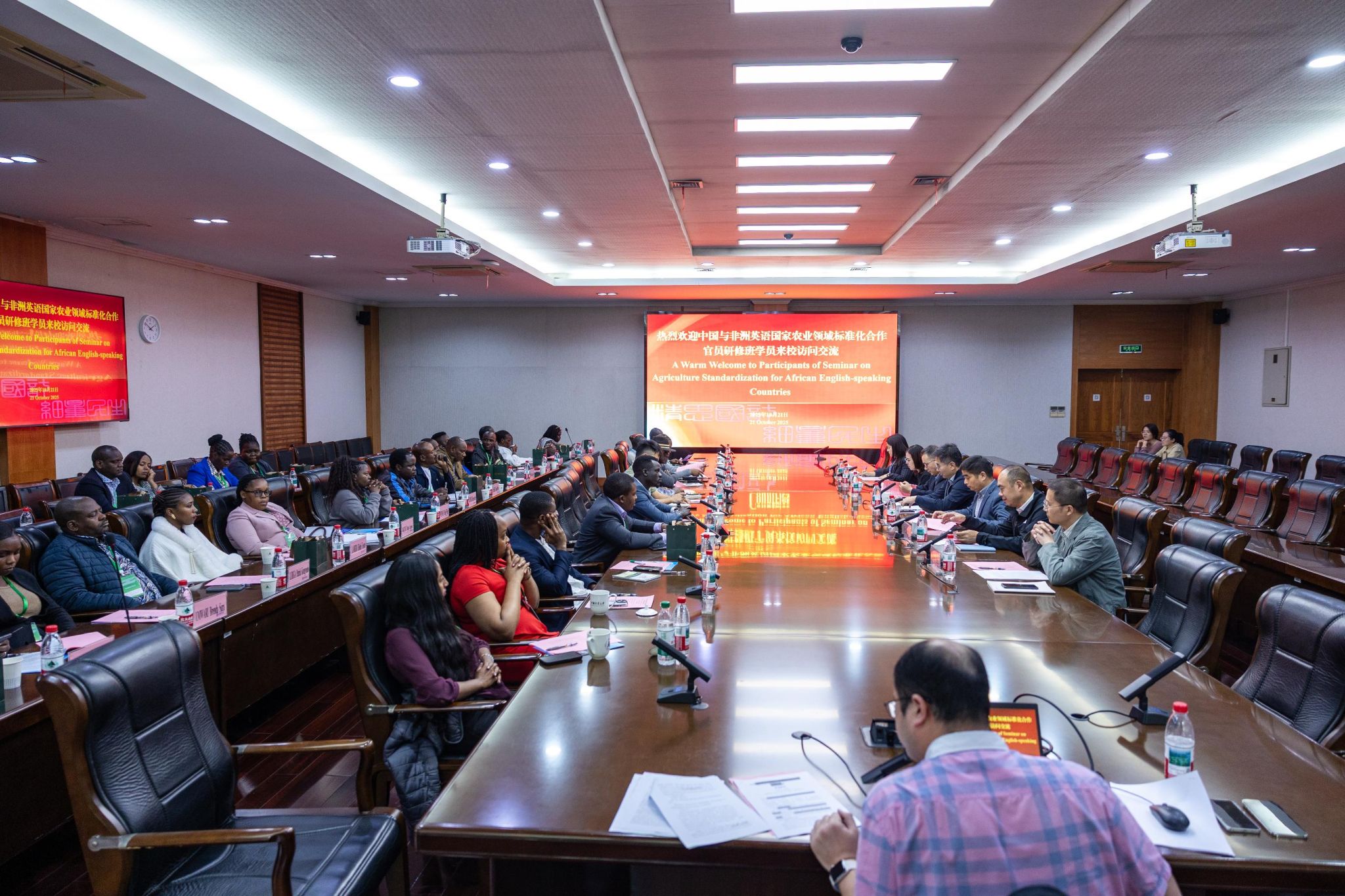10月21日下午,来自非盟委员会、尼日利亚、坦桑尼亚、南苏丹和南非的共30名中国与非洲英语国家农业领域标准化合作官员研修班学员在成都市标准化研究院两名工作人员带领下访问我校。当日,我校在闻厅一楼会议室召开交流座谈会,副校长王斌锐出席本次座谈会,科研院、国际处、经管学院、生命学院和质标学院等部门负责人及相关老师陪同参加。