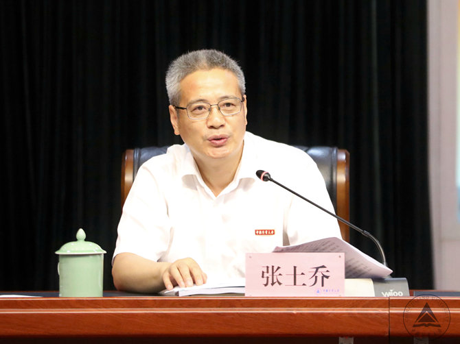 党委书记张土乔在会上指出,今年开学以来,全校上下以习近平新时代中国特色社会主义思想为指导,学习贯彻党的十九大精神和全国教育大会精神,围绕学校2019年工作任务和目标,砥砺奋进,真抓实干,各项工作有进展、有成效、有突破,高标准、高质量地推动学校发展。他强调,当前学校正处在爬坡过坎、跨越发展的关键期,全体党员干部要以开展“不忘初心、牢记使命”主题教育为引领,按照“守初心、担使命、找差距、抓落实”的总要求,不断推进各项工作的落实。一要思想引领,确保主题教育开展有特色、有成效,为学校发展提供坚强保证;二是树立新思想新观念,实现改革创新大跨越,不断提升学校影响力;三要问题导向,找准制约学校发展的“卡脖子”问题,深挖细查动真碰硬,精准施策有的放矢,努力补齐制约学校发展的短板;四是要狠抓不懈,实现作风转变有形象,切实发扬求真务实、乐于奉献的工作作风;五是要只争朝夕,确保工作业绩与安全稳定双落实,充分利用假期,加速推进,比拼赶超,同时排除隐患,确保安全稳定。他希望,全体党员干部要不忘初心、牢记使命,以永不懈怠的精神和一往无前的勇气,凝心努力,全力以赴,扎实推进学校2019年各项工作任务,为实现学校博士点申报目标和高质量发展努力奋斗。