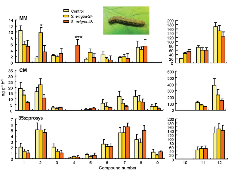 甜菜夜蛾是世界性害虫。近几年,在北京、上海、山东等地都曾出现过上千亩大白菜、大葱和部分番杏及苜蓿遭受虫害,造成绝收的现象。研究人员对MM、CM、35s::prosys三个番茄品种进行了对比分析,结果发现只有MM在应对甜菜夜蛾虫害时,其释放的挥发物能够向邻近番茄预警。