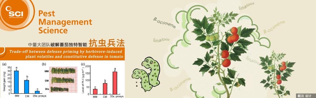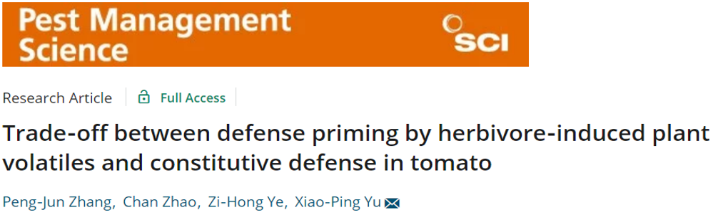 日前,国际昆虫学著名期刊《Pest Management Science》发表了张蓬军为第一作者,俞晓平研究员为通讯作者,题为“Trade-off between defense priming by herbivore-induced plant volatiles and constitutive defense in tomato”的研究论文,解密了番茄的“智能”防御机制。尽管科学家们已经发现,许多植物的挥发物释放和组成防御之间存在着动态平衡,但对这种通过挥发物调控的“预警”防御和组成型防御之间平衡关系的研究并不多。