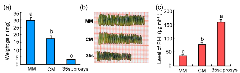 对番茄挥发物的成分分析是本次实验的关键。研究人员收集并分析了挥发物,结果表明只有MM植株经甜菜夜蛾取食后β-ocimene和linalool释放量显著增加。他们还通过测定在健康植株叶片上饲养的甜菜夜蛾幼虫的增重变化,以及健康植株的组成性PI-II蛋白的含量,比较了三个番茄品系的组成抗性水平,结果表明35s::prosys的组成抗虫性最强,CM次之,MM的抗虫性最弱。