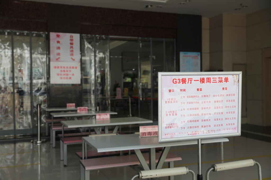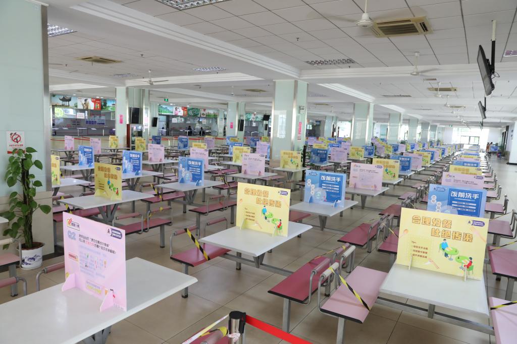 学校现有7个餐厅,根据学生返校复课安排,餐厅将分批次开餐。为避免大量学生聚集,学校延长了供餐时间,并在各餐厅撤掉了一部分餐桌,每张餐桌设置了一张隔板,实行错时就餐制度。