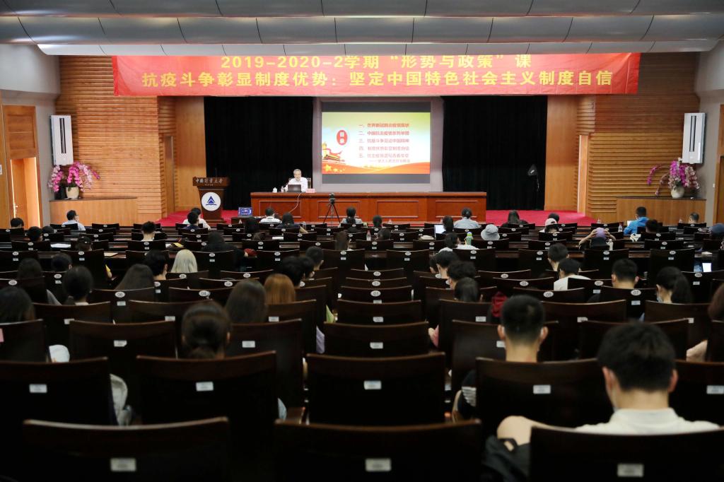 5月13日下午,校党委书记张土乔以“抗疫斗争彰显制度优势:坚定中国特色社会主义制度自信”为题,采用线上线下结合的方式,为400余名18、19级学生上了返校复课后的第一次形势与政策课。
