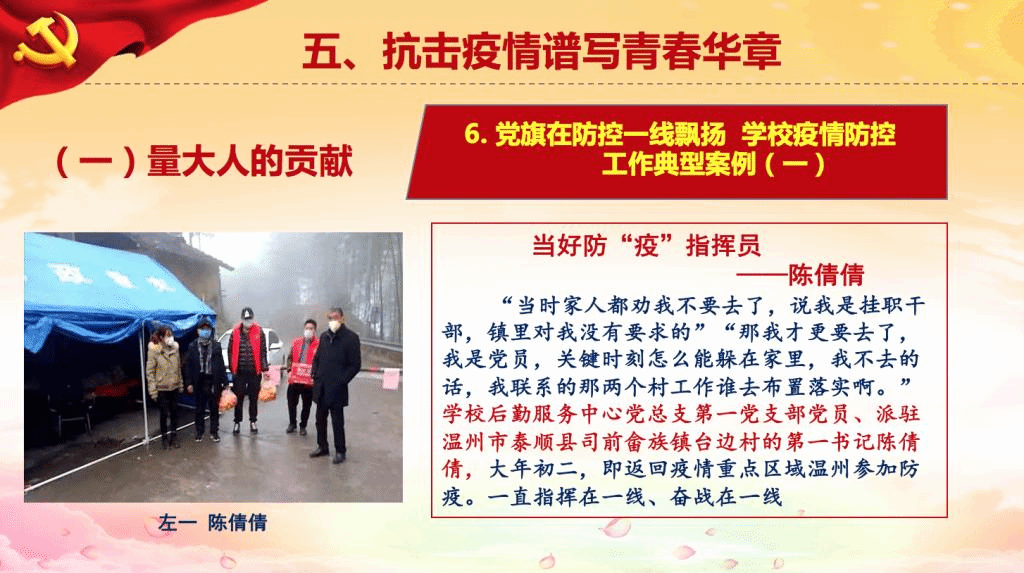 他向同学们展示了学校为师生返校复课所采取的一系列疫情防控举措和成效,讲述了党员干部在抗击疫情中无所畏惧、坚守一线的感人事迹。屏幕上,陈倩倩、金国雄、葛建等一张张逆行而坚定的脸庞彰显着共产党人的初心和使命。他告诉同学们,正是这些主动担当、冲锋在前的党员、干部以工作地、居住地为阵地,充当指挥员、战斗员、守护员,汇聚“红色力量”为师生平安返校复课保驾护航。