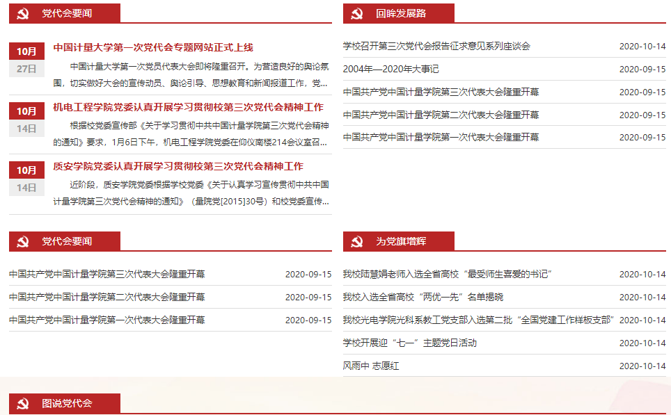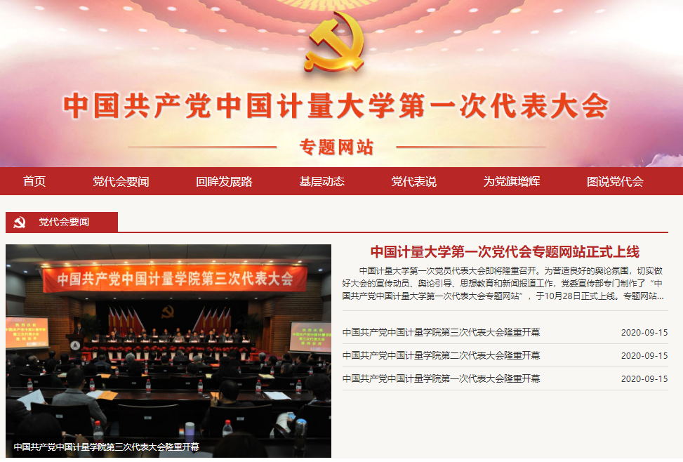 中国计量大学第一次党员代表大会即将隆重召开。为营造良好的舆论氛围,切实做好大会的宣传动员、舆论引导、思想教育和新闻报道工作,党委宣传部专门制作了“中国共产党中国计量大学第一次代表大会专题网站”,于10月28日正式上线。