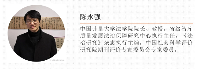 陈永强,中国计量大学法学院院长、教授,浙江省新型高校智库质量发展法治保障研究中心执行主任。复旦大学民商法学博士,中国社会科学院民法学博士后,美国宾夕法尼亚州立大学、德国奥格斯堡大学、中国人民大学访问学者。兼任《法治研究》执行主编,中国社会科学评价研究院期刊评价专家委员会专家委员,中国法学会民法学研究会理事,中国市场监督管理学会理事,浙江省法学会网络法治研究会常务副会长,民法学研究会副会长,破产法学研究会副会长,入选浙江省151人才工程。获浙江省教育厅“三育人”优秀教师、中国计量大学“我最喜爱的老师”等荣誉称号。