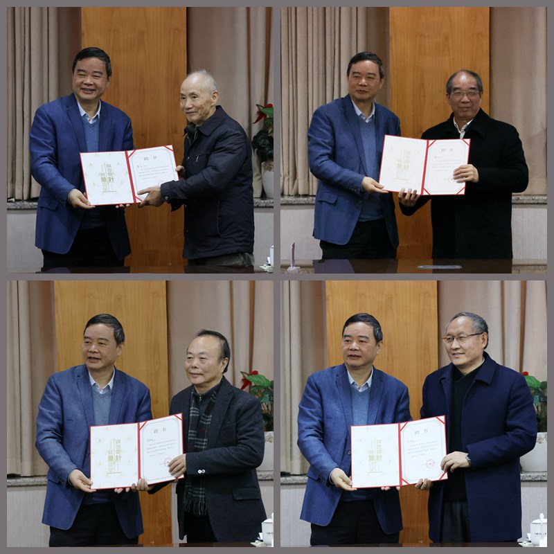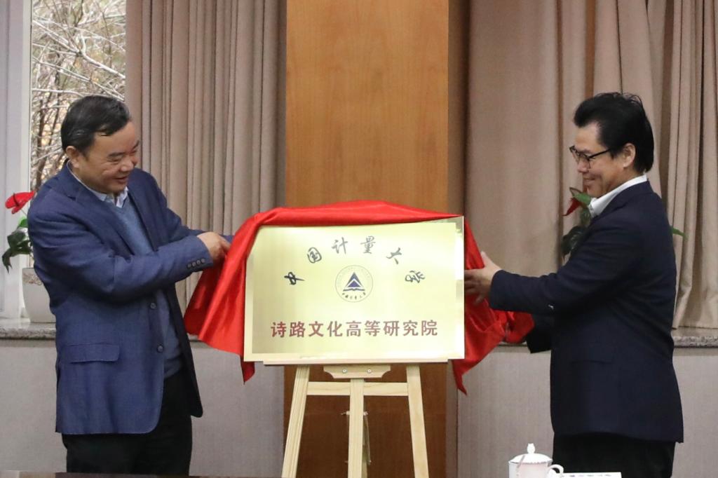 叶菁和肖刚共同为中国计量大学诗路文化高等研究院揭牌。肖刚为复旦大学蒋凡教授,中国唐诗之路研究会会长、南开大学卢盛江教授,中国韵文学会会长、中国唐诗之路研究会副会长、浙江工业大学校务委员会常务副主任肖瑞峰教授,中国唐诗之路研究会副会长、浙江大学胡可先教授颁发诗路文化高等研究院学术顾问聘书。