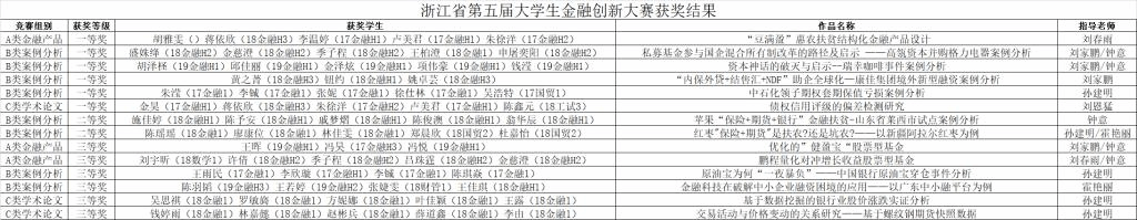 近日,第五届“杭州银行杯”浙江省大学生金融创新大赛在浙江工业大学落下帷幕,我校学生获得省一等奖6项、省二等奖2项、省三等奖6项。我校获得优秀组织奖,钟意老师荣获组织工作先进个人奖。
