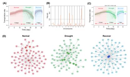 图为控制渐进式干旱条件下蒸腾速率变化的动态QTLs及其网络。(A)IL群体所有株系蒸腾速率的阶段性变化,其平均向量曲线(红色)由Legendre 函数拟合。(B)通过FPP-FM得到曼哈顿图,表明动态蒸腾速率相关的分子标记的显著性。(C)最显著QTL(11号染色体)上的两个等位位点对蒸腾速率的动态效应比较。(D)处理前正常灌溉、渐进式干旱和复水等三个不同阶段下QTL互作网络。每个网络中的枢纽QTLs用深色高亮显示。
