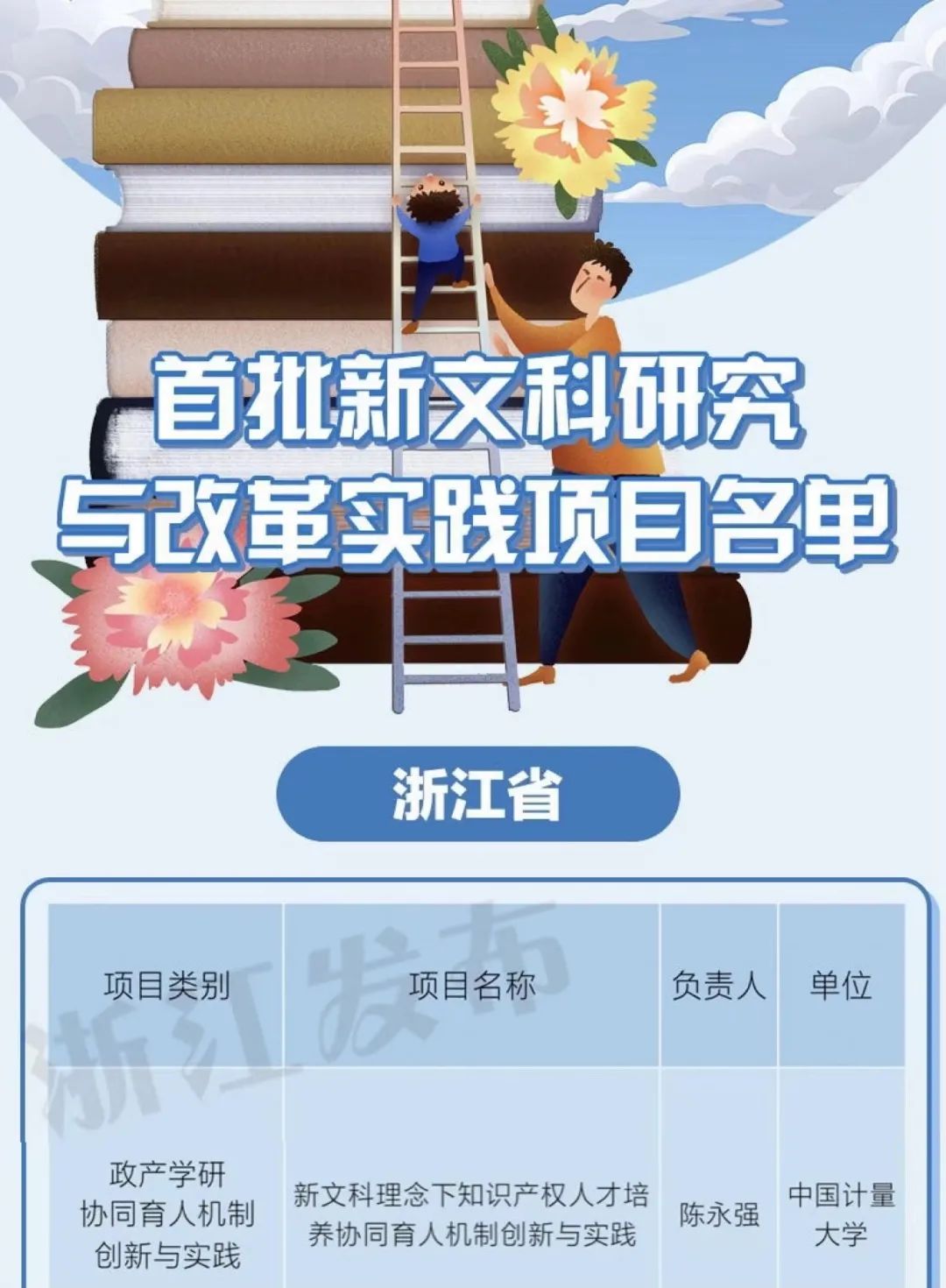 近日,教育部公布首批新文科研究与改革实践项目名单,我校法学院陈永强教授牵头申报的项目“新文科理念下知识产权人才培养协同育人机制创新与实践”成功入选。据悉,“新文科”为教改类最高级别的项目,浙江共有16所高校的26个项目获批立项,全国范围内法学类共有76个项目获准立项。