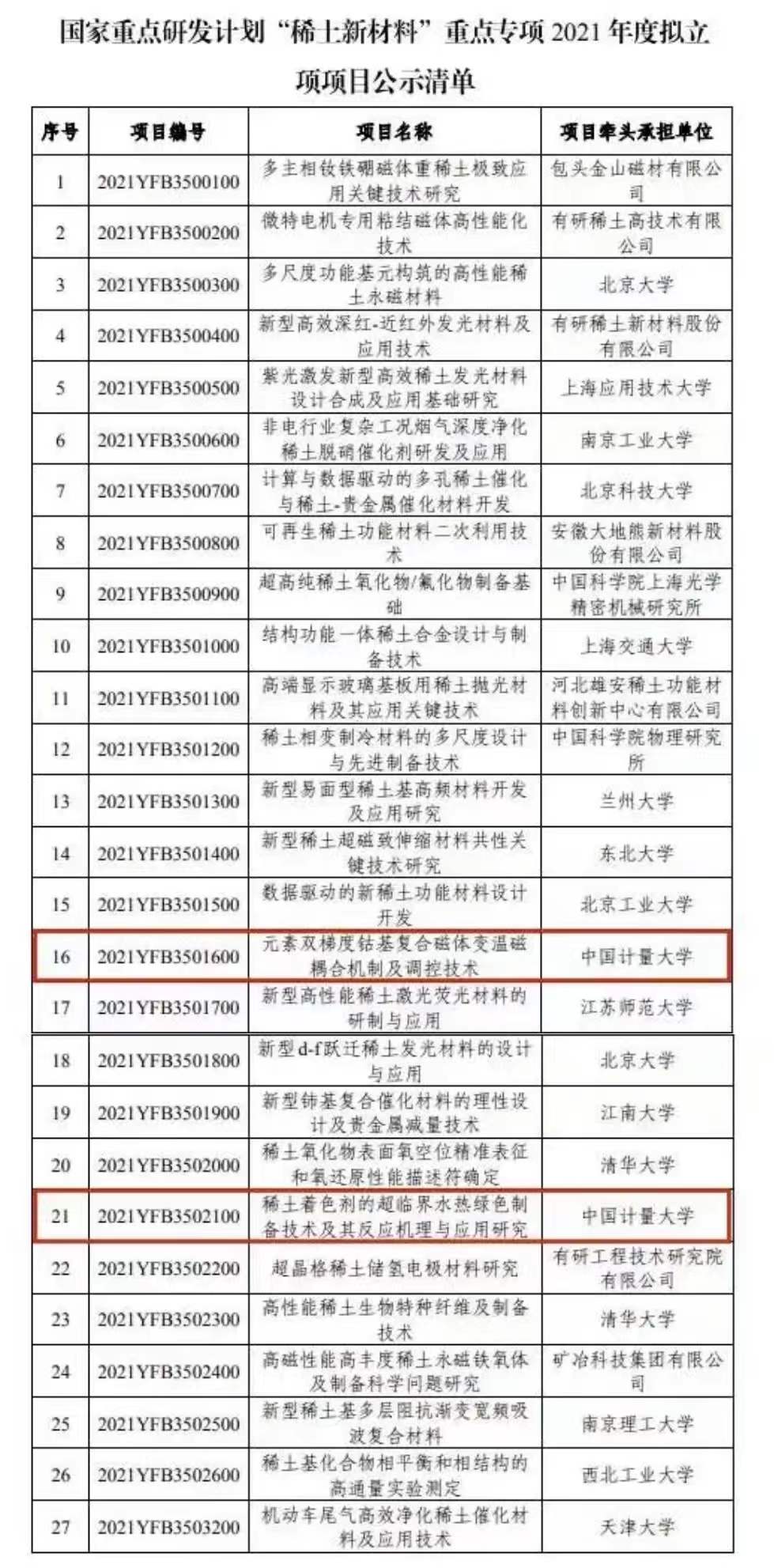 近日,根据《国务院关于改进加强中央财政科研项目和资金管理的若干意见》(国发〔2014〕11号)、《国务院关于深化中央财政科技计划(专项、基金等)管理改革方案的通知》(国发〔2014〕64号)、《科技部、财政部关于印发<国家重点研发计划管理暂行办法>的通知》(国科发资〔2017〕152号)等文件要求,工业和信息化部产业发展促进中心对“稀土新材料”重点专项2021年度拟立项项目进行公示(公示时间为2021年12月9日至2021年12月14日),我校申报的2个项目名列其中,成功获批2021年度国家重点研发计划“稀土新材料”重点专项青年科学家项目立项。