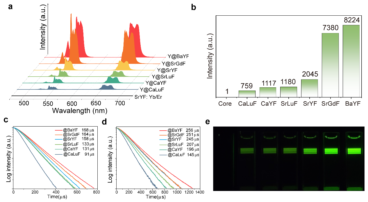 图1 :以SrYF为核,包覆不同壳层后的上转换光谱(a),积分强度变化(b),寿命衰减曲线(c)与荧光照片(d)。