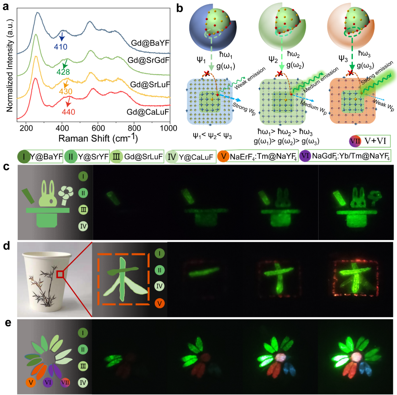 图2 (a)不同核壳纳米晶的拉曼光谱,(b)界面声子态密度调控机理示意图,(c-e)采用系列具有不同激发阈值纳米晶印刷的图案,随功率变化的荧光照片。