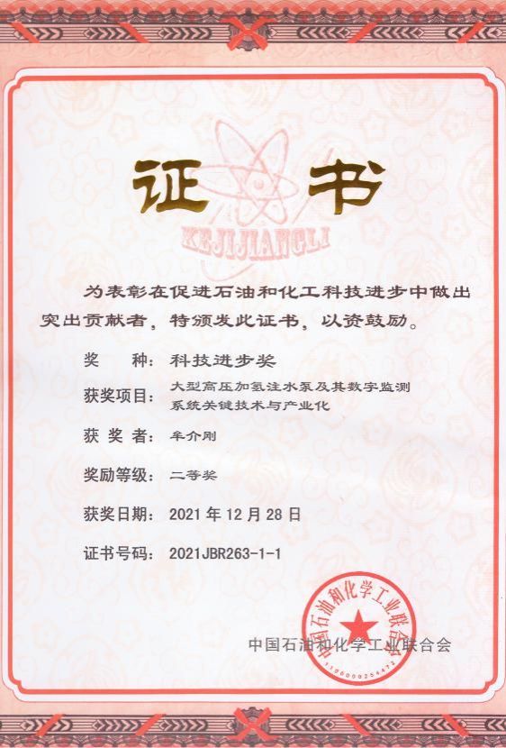 12月28日,中国石油和化学工业联合会在武汉召开“全国石油和化工科技创新大会”。大会表彰2021年度我国石油和化工行业科技创新的获奖单位和个人。来自全国重点石油和化工企业、科研单位、大专院校,以及新闻媒体的共计300余名代表参加会议。我校牟介刚教授、吴登昊副教授、谷云庆副教授共同完成的项目“大型高压加氢注水泵及其数字监测系统关键技术与产业化”获中国石油和化学工业联合会科技进步二等奖。