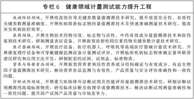 (十五)服务大众健康与安全。加快医疗健康领域计量服务体系建设,围绕疾病防控、生物医药、诊断试剂、高端医疗器械、康复理疗设备、可穿戴设备、营养与保健食品等开展关键计量测试技术研究和应用。加强体育设施和器材计量技术研究和测试服务,促进体育产业高质量发展。完善地质和海洋灾害、地震、洪涝干旱、森林草原火灾等自然灾害防御的计量保障体系,提高防灾、减灾、救灾计量能力。加强危险化学品、矿山、建筑施工、地质勘查等安全生产相关计量器具的研制生产和监督管理。加强公共安全领域计量服务体系建设,开展交通安全、社会稳定和安全等领域关键计量测试技术研究和应用,推进交通监管设备、警用装备、刑事技术产品等计量测试基础设施建设。