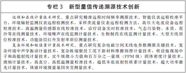 (六)开展新型量值传递溯源技术研究。针对复杂环境、实时工况环境和极端环境的计量需求,研究新型量值传递溯源方法,解决综合参量的准确测量难题。建立扁平化场景高适应性的量值溯源体系。研究数字化模拟测量、工业物联、跨尺度测量、复杂系统综合计量等关键技术。加强国家标准物质在制备、定值、保存、溯源评价及量值传递应用新模式等方面的全寿命周期、系统性研究与评价。加快推进计量基准、计量标准及标准物质智能化、网络化技术的研究和应用。
