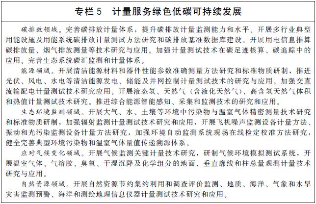 (十四)支撑碳达峰碳中和目标实现。完善温室气体排放计量监测体系,加强碳排放关键计量测试技术研究和应用,健全碳计量标准装置,为温室气体排放可测量、可报告、可核查提供计量支撑。建立碳排放计量审查制度,强化重点排放单位的碳计量要求。在城市和园区开展低碳计量试点。建立完善资源环境计量体系,建设一批国家能源、水文水资源和环境计量中心,推进能耗、水资源、环境监测系统建设,加强能源资源和环境计量数据分析挖掘和利用。加快推进能源资源计量服务示范工程建设,引导和培育能源资源和环境计量服务市场。