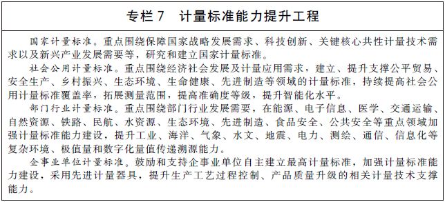 (十九)推进计量标准建设。改革计量标准体系架构,统筹考虑技术能力和现实需求,建立国家计量标准、社会公用计量标准、部门行业计量标准、企事业单位计量标准为主体的层次分明、链条清晰的计量标准基础设施网络。实施计量标准能力提升工程,在重点领域新建一批国家计量标准,加快推进各级各类计量标准技术改造和升级换代。建立嵌入式、芯片级、小型化的计量标准,推动对制造过程的实时在线测量和最佳控制。
