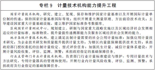 (二十一)加快计量技术机构建设。深化计量技术机构改革创新发展,优化整合国家计量技术机构、区域国家计量测试中心、地方各级计量技术机构和行业主管部门专业计量技术机构。大力推动国家计量技术机构创新发展,通过组织开展重大测量原理、方法前沿技术攻关,建立量子计量基准并保持国际等效,提供一流的量值溯源和测量服务,支撑国家科技创新、工业竞争力提升和经济社会发展。充分发挥省级人民政府和行业主管部门计量基础设施规划建设自主权,加强普惠性、基础性和公益性计量基础设施建设。提升计量技术机构服务市场的能力和水平,推动形成一批专业领域服务平台,培育一批专业化、社会化、网络化的服务机构,为经济社会发展和行业创新提供计量测试服务。