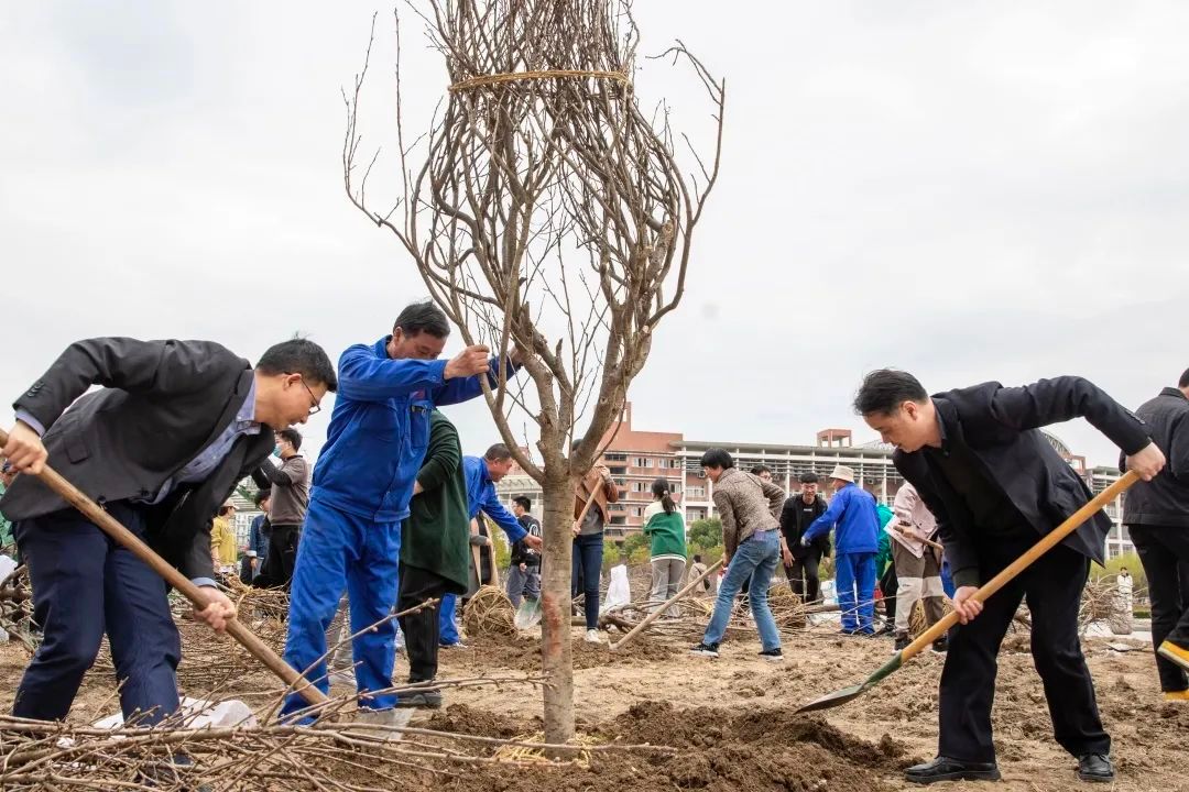 活动现场,校领导与高层次人才一起挥锹铲土、踩实新土、堆起围堰、提桶浇水,用实际行动践行“绿水青山就是金山银山”的生态理念,树立生态文明的意识和观念,发扬中华民族爱树植树护树好传统,为美丽校园减碳添绿。