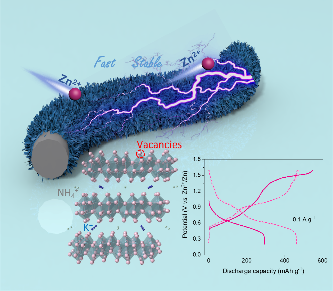 近日,材化学院王疆瑛教授团队在水系锌离子电池正极材料取得重要进展,相关成果以“Potassium Ammonium Vanadate with Rich Oxygen Vacancies for Fast and Highly Stable Zn-Ion Storage”为题发表在国际著名期刊ACS Nano(IF=15. 881)上。材化学院青年教师宗泉为文章的第一作者,中国计量大学为第一通讯单位。