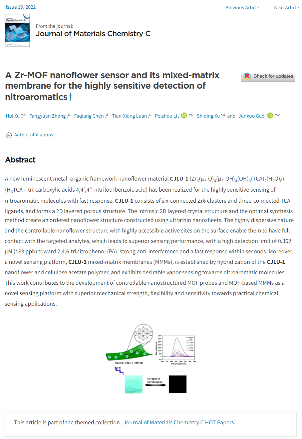 近日,我校光电学院徐时清团队在多孔MOFs材料混合基质膜做环境污染物硝基芳烃的高效荧光传感研究方面取得重要进展,相关成果以“A Zr-MOF nanoflower sensor and its mixed-matrix membrane for the highly sensitive detection of nitroaromatics ”为题发表在国际著名期刊J. Mater. Chem. C上(IF=7.393),并入选为期刊热点文章(HOT Papers)。光电学院青年教师徐绘为文章的第一作者,中国计量大学为第一通讯单位。同时,该工作被RSC 英国皇家化学会官方公众号以《中国计量大学 JMCC | Zr-MOF 纳米花及其混合基质膜对硝基芳烃的高灵敏荧光探测》为题进行报道(https://mp.weixin.qq.com/s/rqUERiHvd2WPJBKvuaIzyg)。