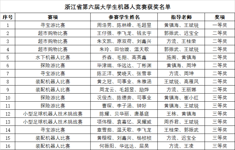 近日,浙江省第六届大学生机器人竞赛在杭州职业技术学院圆满结束,我校共有42名学生组成的16支队伍参加,共摘得省一等奖1项,省二等奖8项,省三等奖7项,参赛队伍均在比赛中获奖,创我校在该项赛事中的最好成绩。