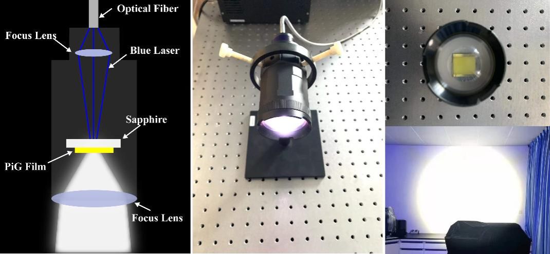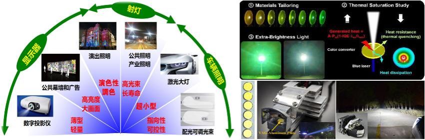 激光照明作为新一代的大功率、高亮度照明技术,在汽车大灯、航空航海照明、军用手电、激光影院以及激光电视等领域具有广泛的应用前景。在激光照明技术中,荧光材料起到光色转换的重要作用,决定器件的发光效率、发光强度、显色性及寿命等关键性能参数。传统的固态照明封装材料(如有机树脂等)不但散热性能差,而且在长时间、高功率激光照射下会出现碳化和烧蚀等损伤现象,影响荧光材料的发光性能,从而最终导致整个光源器件的失效。为了获得更高光效和可靠性的激光照明器件,荧光转换材料须具有优异的散热性能及热稳定性。因此,研制耐高功率密度激发的高可靠性荧光转换材料成为激光照明技术(包括激光显示)进一步发展的关键。