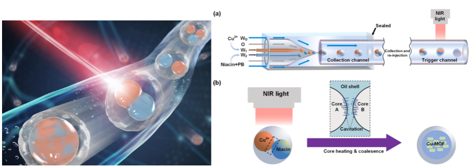 液滴微流控技术产生的水包油包水型(W/O/W)双乳液滴(Double Emulsion Drops, DED)一直在单细胞分析、药物释放、微颗粒合成等领域有着广泛应用。通过对微流体的精确调控,可实现纳升级流体的封装。此外,DED独特的核壳结构可以保护内部试剂不受外部环境和其他分析样品造成的交叉污染,是一种理想的微反应容器模板。然而,规模化的连续微反应需要在DED内实现内核液滴高效率以及高通量的连续融合。鉴于此,本研究提出一种非接触、即时、可控的用于双乳液滴内核融合的方法,即通过近红外光(NIR)连续触发DED内核液滴的融合。在NIR照射下,由于普鲁士蓝(PB)的光热特性,含有PB纳米颗粒的内核液滴迅速升温并产生空化现象。空化产生的微气泡引起的界面扰动破坏了两个内核液滴之间的界面平衡,致使两个内核液滴发生了融合。研究中内核连续融合效率高达98%,并且利用NIR触发DED内核融合,合成了铜金属有机骨架(MOF)。此外,通过NIR照射,三核DED中实现了动态两步融合。此项工作的开展将为微尺度下化学反应提供灵活的技术和平台支撑。