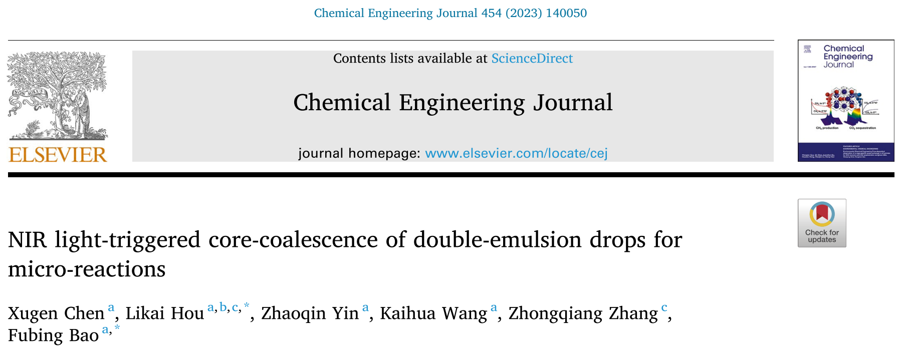 近日,我校计量测试工程学院包福兵教授团队指导的硕士研究生陈旭根在国际学术期刊Chemical Engineering Journal(IF 16.744,中科院1区)上发表了题为“NIR light-triggered core-coalescence of double-emulsion drops for micro-reactions”的研究论文,报道了近红外诱导双乳液滴内核融合的纳升级微反应器研究。第一作者为我校计量测试工程学院硕士研究生陈旭根,通讯作者为侯立凯副教授、包福兵教授。