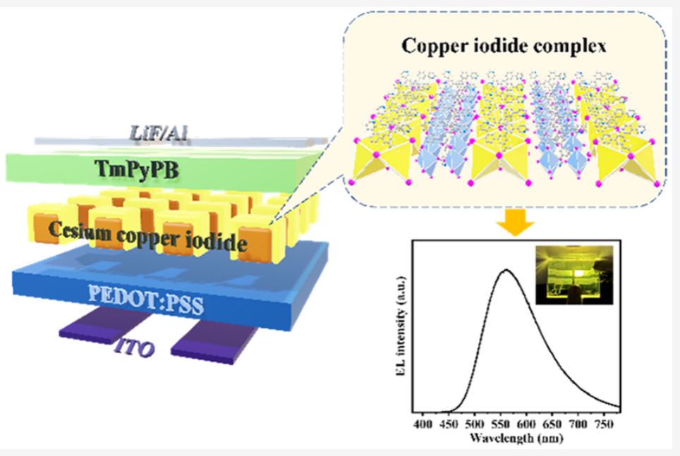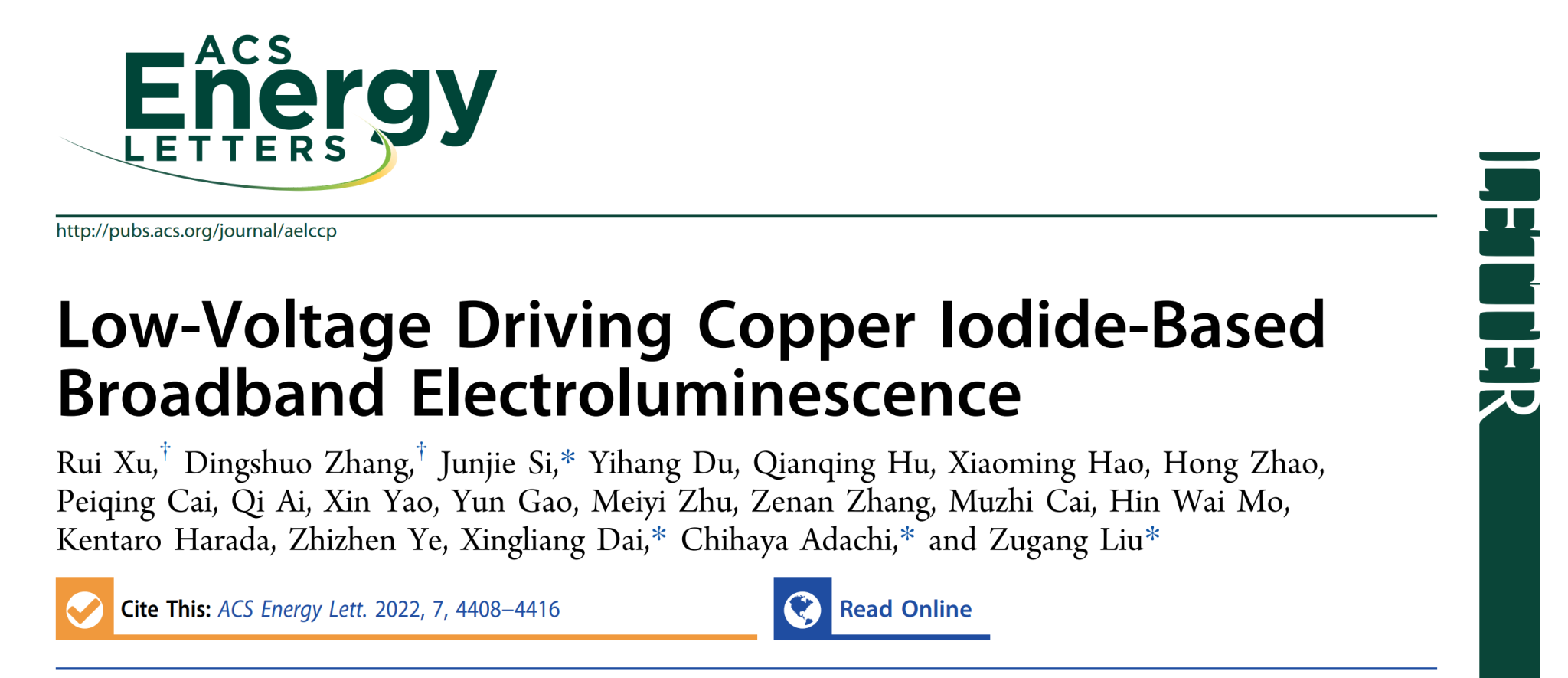 近日,我校光学与电子科技学院刘祖刚教授团队在国际著名学术期刊ASC Energy Letter(IF 23.991,中科院1区)上,发表题为“Low-Voltage Driving Copper Iodide-Based Broadband Electroluminescence”的高水平论文。第一作者为我校光学与电子科技学院印刷光电子团队研究生徐锐同学,我校青年教师司俊杰博士为第一通讯作者,刘祖刚教授为共同通讯作者。