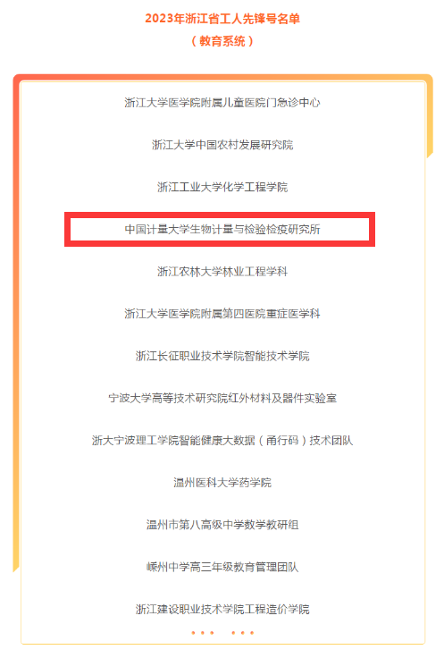 3月31日,浙江省总工会印发《关于表彰 2023 年浙江省五一劳动奖状、奖章和工人先锋号的决定》,我校生物计量与检验检疫研究所获2023年“浙江省工人先锋号”荣誉称号。