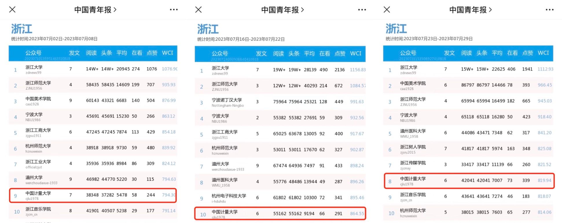 暑假期间,学校官微持续围绕学校中心工作,及时有效报道学校各项事业发展的热点亮点,精心制作推出兼具新闻价值与传播价值的新媒体产品。7月,学校官方微信公众号月度新增关注人数达历史最高6788人,发布推送24篇,总阅读量超21万,连续三周入围中国青年报本科院校官方微信传播力排行榜浙江省十强。其中,《补贴75万起,中国计量大学广纳英才,欢迎加盟!》一文阅读量高达2万,为月度阅读量最高的推文。《生源质量稳步提升!中量大2023年浙江普通一段录取顺利进行》《你心心念念的中量大录取通知书,在路上啦!》《561.75分,揭密学霸寝室!》等推送阅读量均超过1万。学校其他各新媒体平台同样暑期不停更、工作不断线。7月,中国计量大学官方微博发文110篇;中国计量大学学习强国号发文34篇;中国计量大学今日头条号发文12篇。