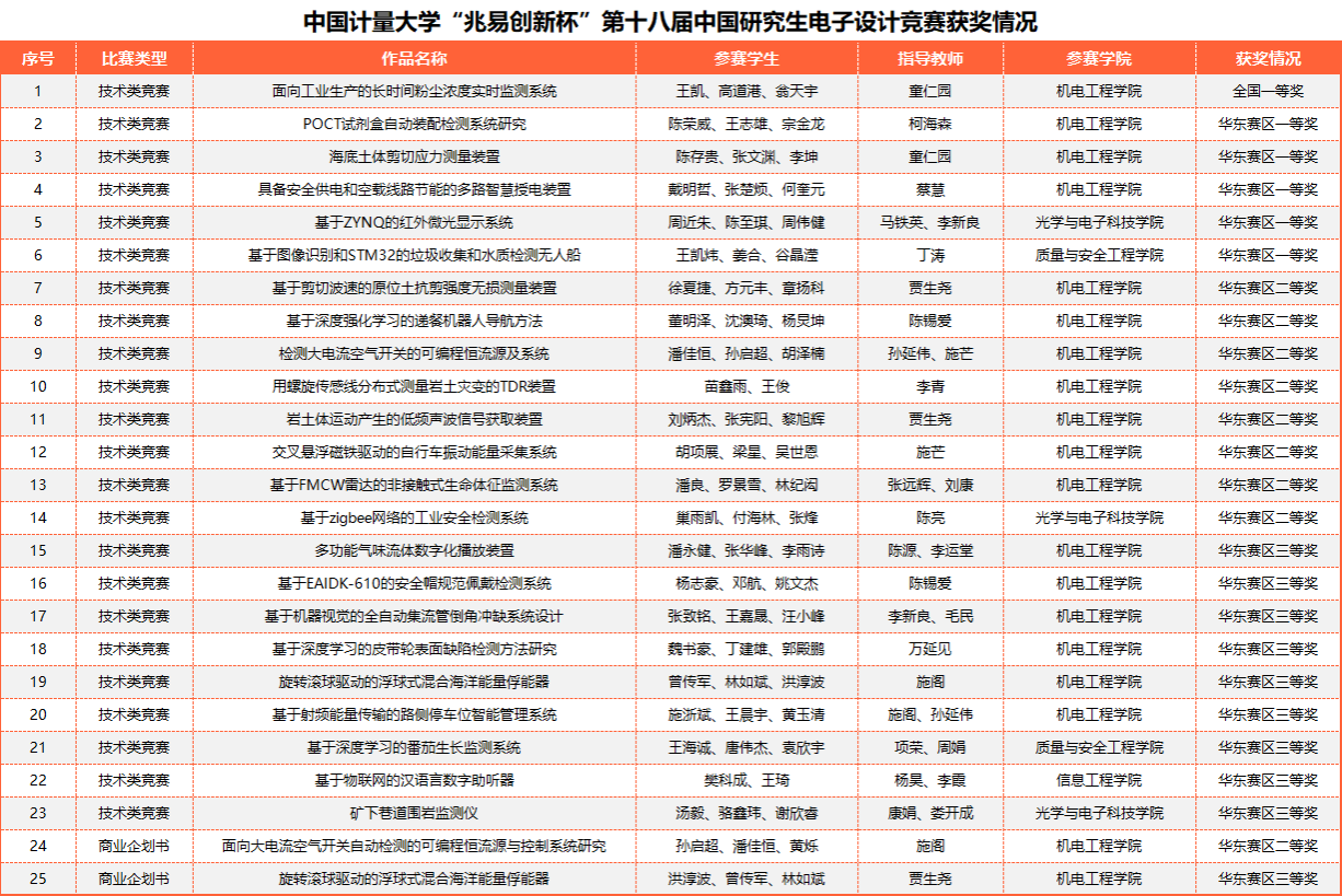 近日,“兆易创新杯”第十八届中国研究生电子设计竞赛(以下简称“研电赛”)全国总决赛在东莞理工学院落下帷幕,经过校赛、初赛、全国总决赛历时近半年的层层选拔,我校组织报名参赛的27支队伍,共获得技术类竞赛国家一等奖1项,华东赛区一等奖5项,华东赛区二等奖8项,华东赛区三等奖9项,商业计划书类华东赛区二等奖1项,三等奖1项,获奖率高达92.6%。其中,来自机电工程学院的“面向工业生产的长时间粉尘浓度实时监测系统”作品获得全国总决赛一等奖,团队指导教师童仁园获优秀指导教师称号。