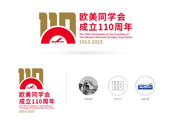 设计理念:以数字“110”与“桥梁”为设计元素,凸显欧美同学会作为党联系广大留学人员的桥梁纽带作用;融入会徽中代表中国传统书写工具的毛笔和西方传统书写工具的羽毛笔,彰显欧美同学会作为留学报国的人才库、建言献策的智囊团、开展民间外交的生力军这一新时代的职能定位。色彩采用中国红,体现“欧美同学会成立110周年”这一喜庆而热烈的主题;传承金,则展现了欧美同学会悠久的光荣历史和崭新的时代风貌。