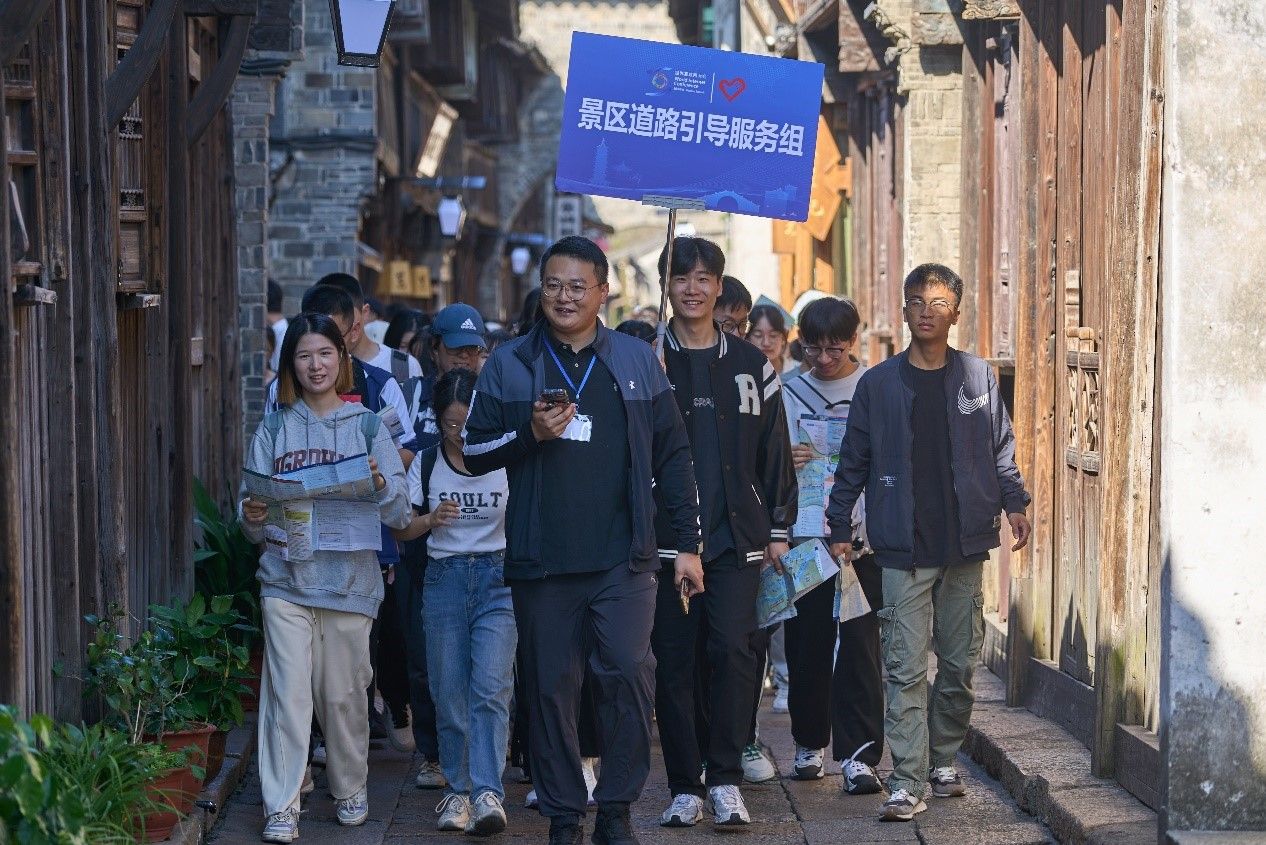 志愿者“小梧桐”周舟的点位在一条充满烟火气的小道里,是望津里站下车的嘉宾们的必经之路。身处美食街区,人流量很大,她不仅要做路线指引,还要为来往的嘉宾提供美食的推荐介绍。当用英文成功引导国际友人品尝乌镇的特色美食,国际友人为她竖起大拇指夸道“So beautiful”时,周舟开心地说:“所有的疲惫都在这一刻被消融了。”