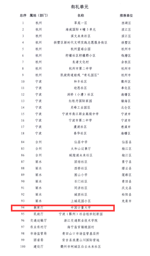 近日,浙江省精神文明建设委员会办公室公布“浙江有礼·四个一百”典型展示名单,我校上榜“有礼单元”名单,是唯一入选的浙江省本科高校,这也标志着我校在“有礼校园”方面的示范建设更进一步。