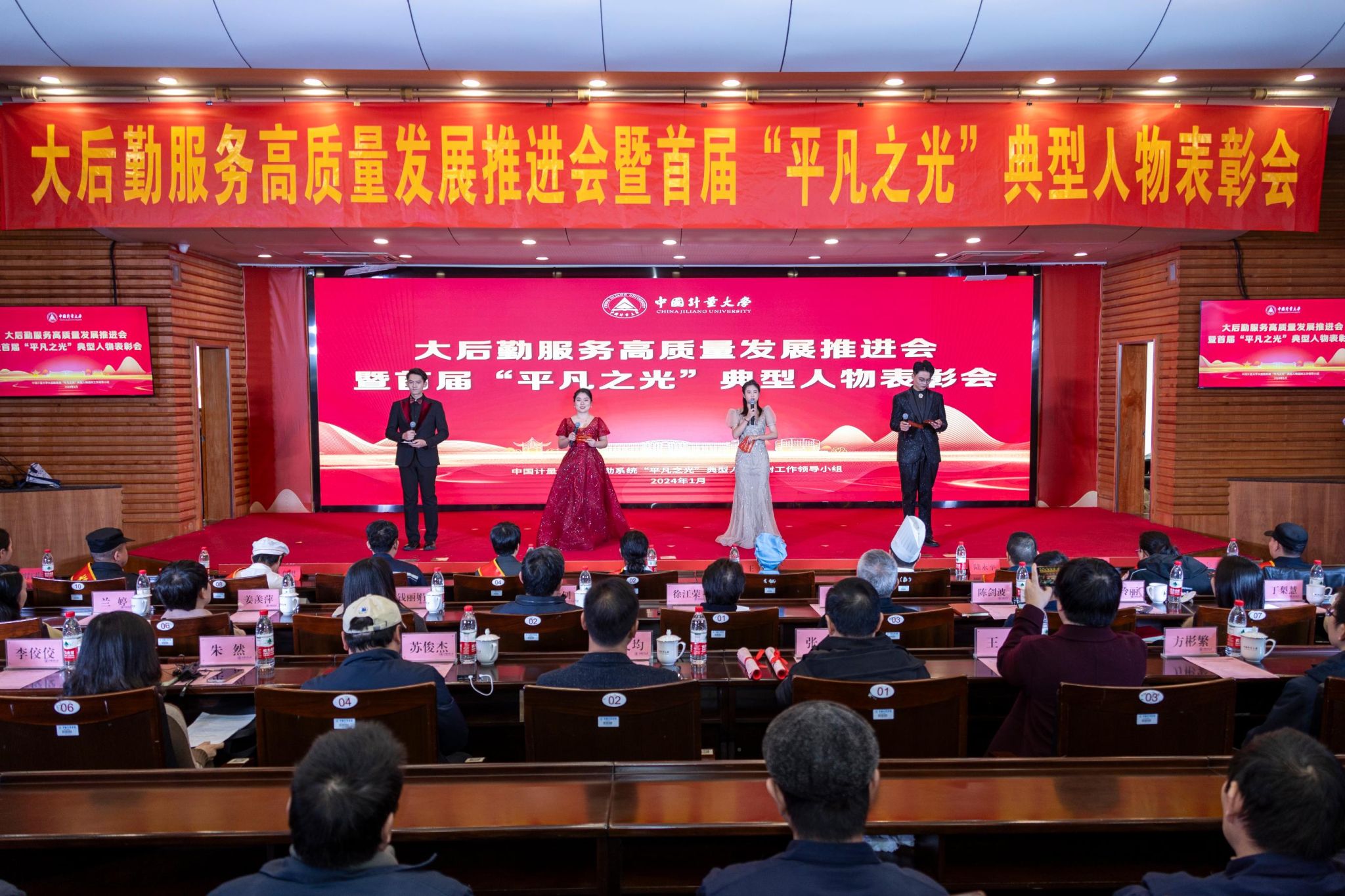 1月17日下午,大后勤服务高质量发展推进会暨首届“平凡之光”典型人物表彰会在我校闻厅二楼报告厅举行。校长徐江荣、副校长王迪钊出席会议,郭良宏研究员、钱丽娟教授受邀出席。大后勤系统“平凡之光”典型人物选树工作领导小组成员、后勤保障系统各部门领导及职工代表参加会议。