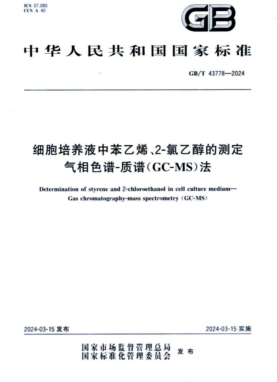 国家市场监督管理总局(国家标准化管理委员会)于3月15日发布的2024年第1号公告中,我校陈春教授主持制定的国家标准《细胞培养液中苯乙烯、2-氯乙醇的测定气相色谱-质谱(GC-MS)法》(GB/T 43778-2024)正式发布并实施。