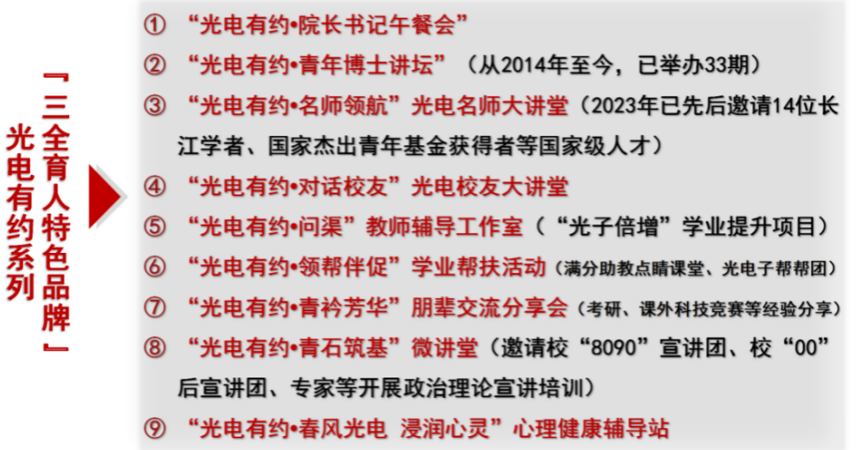 三是聚焦培根铸魂,实施“红色文化”工程,凝聚党建向心力。通过校内校外同向式熏陶、线上线下泛在式育人,织密纵横交错的多维度红色场域,让党建育人有阵地、有基础;通过持续推进“三基色”调色行动、“守护红色根脉七个一”主题党日、“光电有约”三全育人、“沐光行廉·清风光电”等学院特色品牌建设,让党建活动有创新、成体系。
