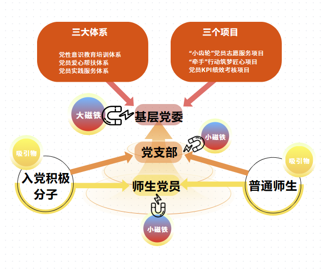 下一步,支部将着力构建多输入、分层次、可扩展的“小磁铁”能量网,不断践行目标明确、相互吸引、辐射带动的支部“磁铁效应”工作机制,实现会反馈、可修正、能循环的“磁铁工程”闭环,真正做到支部建设有方向、支部工作有引力、支部成效有辐射,建设“一融双高”型师生联合党支部,实现以高质量党建引领高质量发展的效果。