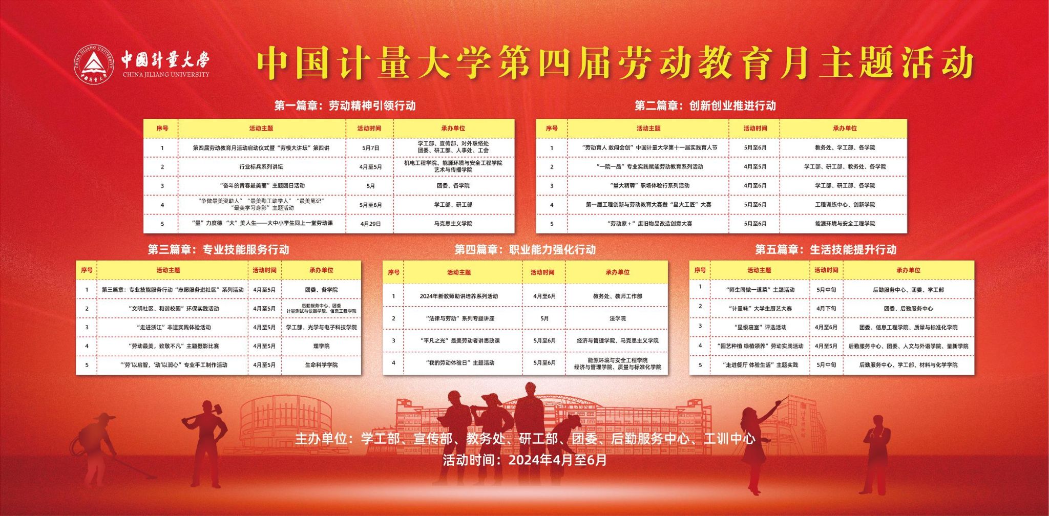 第四届劳动教育月由学工部、宣传部、教务处、研工部、团委、后勤服务中心、工训中心等相关部门联合主办,各学院承办,涵盖劳动精神引领、创新创业推进、专业技能服务、职业能力强化、生活技能提升等五项行动,包括劳模大讲坛、大中小学生同上一堂劳动课、“走进浙江”非遗实践体验、工程创新与劳动教育大赛、志愿服务进社区、“劳动最美,致敬不凡”主题摄影、我的劳动体验日、师生同做一道菜等33项活动,将在5月至6月集中开展。