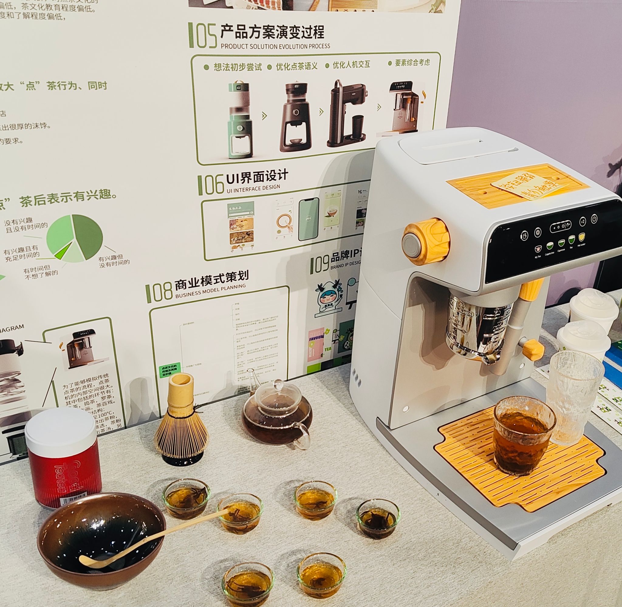 在浙江图书馆展厅内,一台点茶机展示功能模型格外显眼。“点茶”常常因其复杂性以及大众认知的匮乏被人们所忽视,工业设计专业的金彬烨设计的数字化点茶机在一旋一画间品味古今茶趣,以数字化传承非遗茶韵。点茶机的点茶步骤简单有趣,倒入茶叶和水,旋转旋钮即可出茶水;接着打开点茶匙,在茶汤上作画,或者打开蓝牙设置,在手机app上定制点茶图像。金彬烨通过调研访谈、系统思维、行为设计等多种方式使新式点茶机兼具了实用性与情感体验,不仅做到了保护、推广和创新,还提升了茶文化体验,拓展了茶文化市场,同时促进跨文化交流。金彬烨说,“希望利用现代技术,突出点茶的趣味性,简化点茶的繁复性,吸引更多年轻人参与和关注茶文化,谋求传统点茶由非遗走向新生的新方式。”