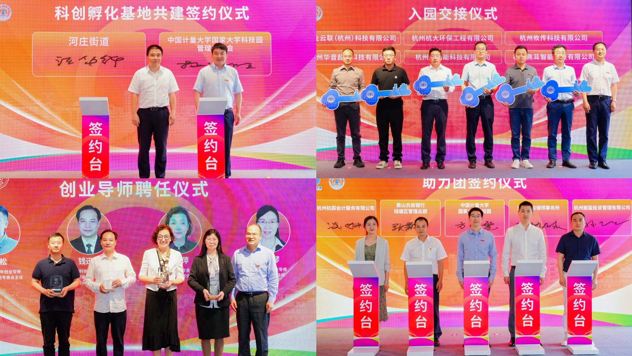 开园启动仪式上,中国计量大学与河庄街道进行了科创孵化基地共建签约仪式,首批6家入驻企业代表与中国计量大学举行了园企交接仪式,现场还聘任了创业导师4人、助力机构4家,为充分发挥园区产业培育服务平台功能、助力园区企业高质量发展提供了有力保障。此外,教师企业代表杭州攸传科技有限公司、入驻企业代表杭州杭大环保工程有限公司相关负责人进行了发言交流。