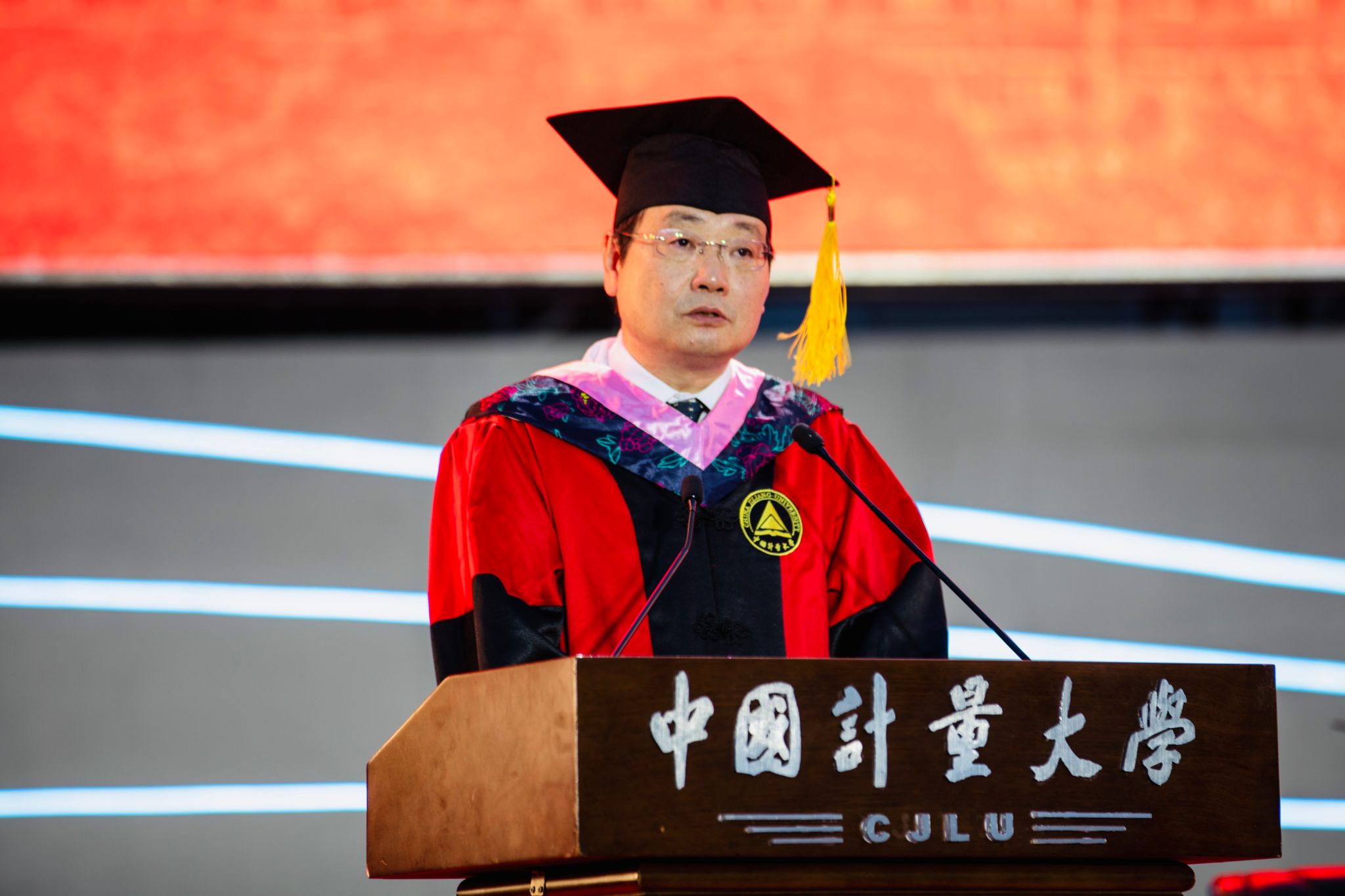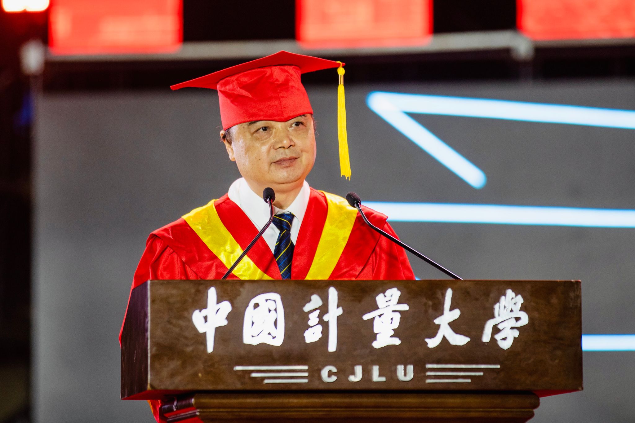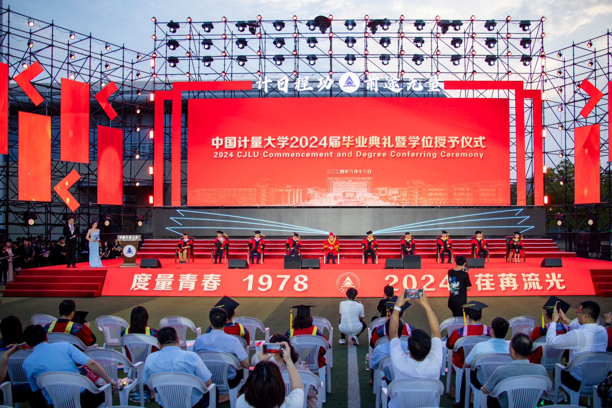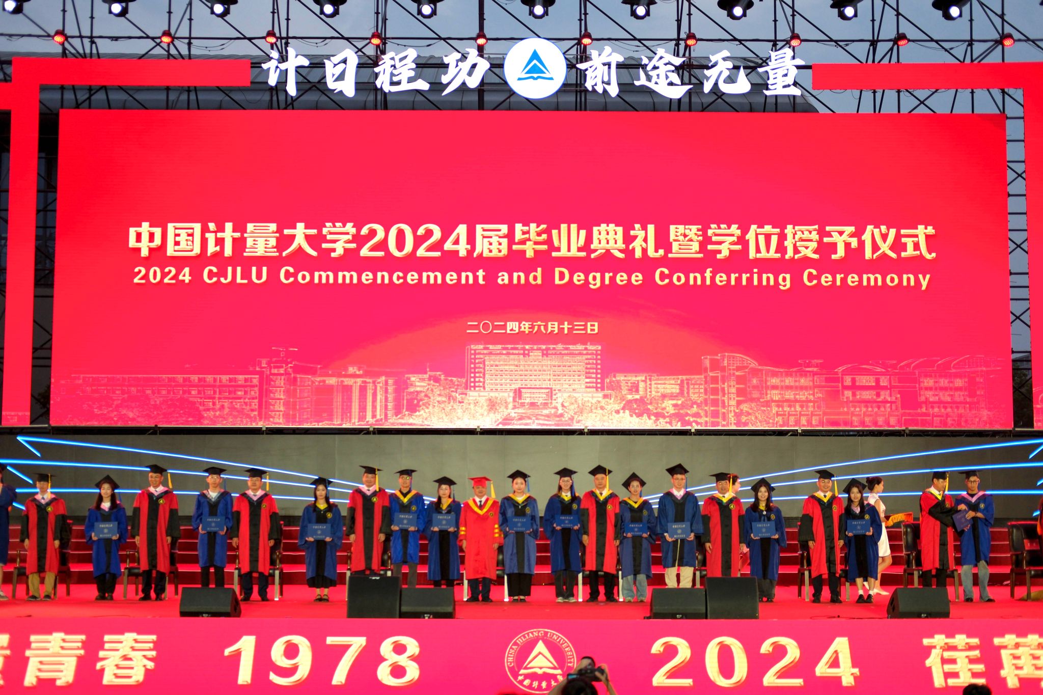 程刚宣读了2024届省级、校级优秀毕业生名单,2024届毕业生校友联络员和年级校友会理事成员名单,王新庆宣读了中国计量大学学位评定委员会关于授予学位的决定。校领导为2024届本科毕业生代表、硕士毕业生代表、国际学生毕业生代表拨穗正冠,颁发学位证书,为省优秀毕业生代表、校友联络员颁发荣誉证书。